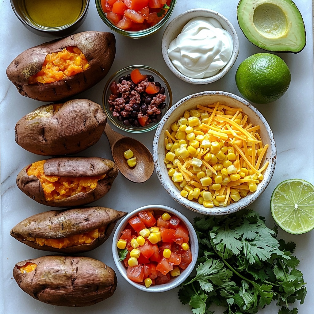 The magic in this Taco Stuffed Sweet Potatoes for a Hearty Dinner Delight Recipe lies in its simple yet thoughtfully selected ingredients. Each component plays a vital role, from the caramelized sweetness of the sweet potato to the spicy warmth of the taco seasoning, and the creamy toppings that finish it all off. Here’s what you need to bring this delightful dish to life: