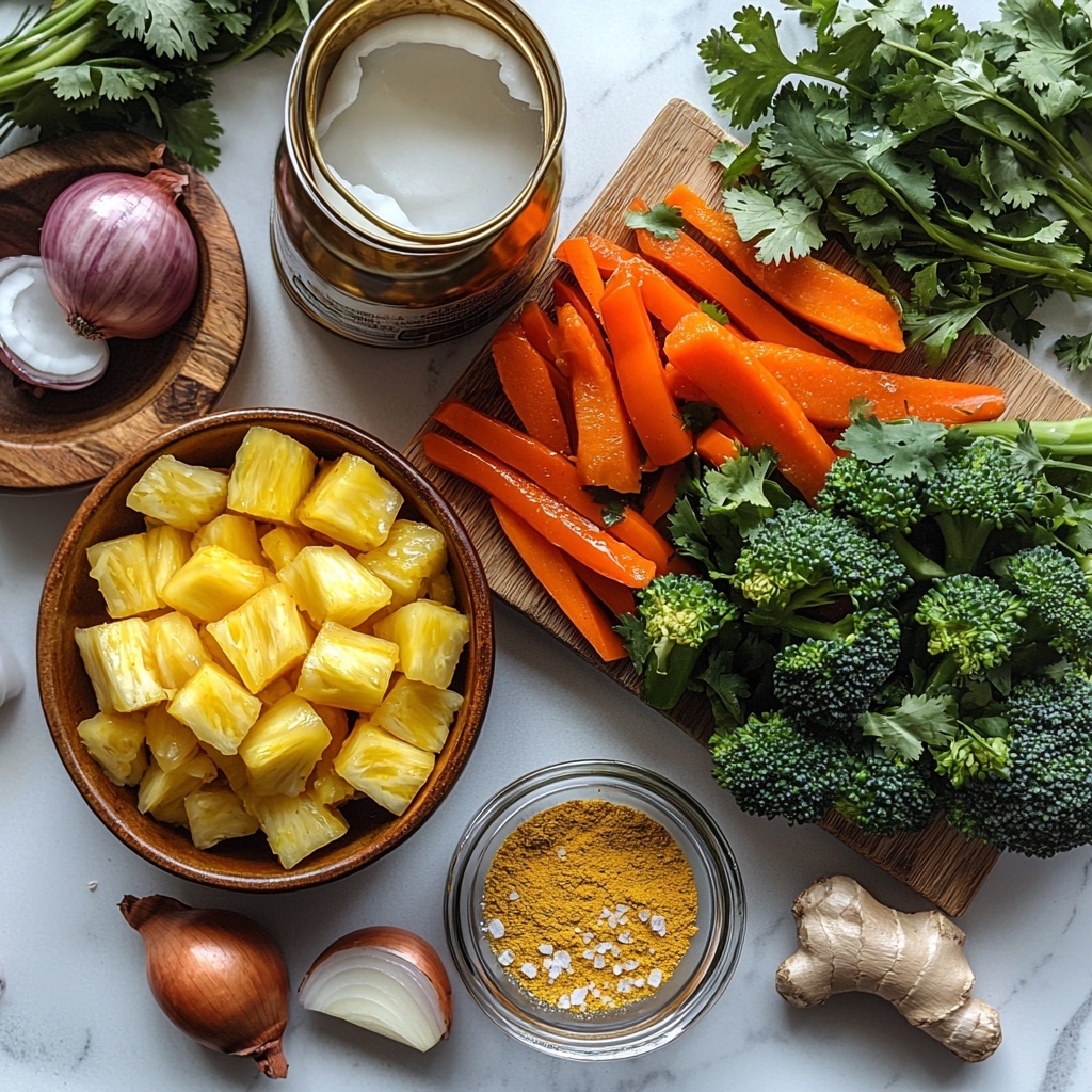 This Vegetable Curry with Coconut Milk and Pineapple Recipe uses straightforward, wholesome ingredients that each play a crucial role in delivering texture, depth, and vibrant color to the dish. From the fragrant spices to the fresh produce, every component shines through.