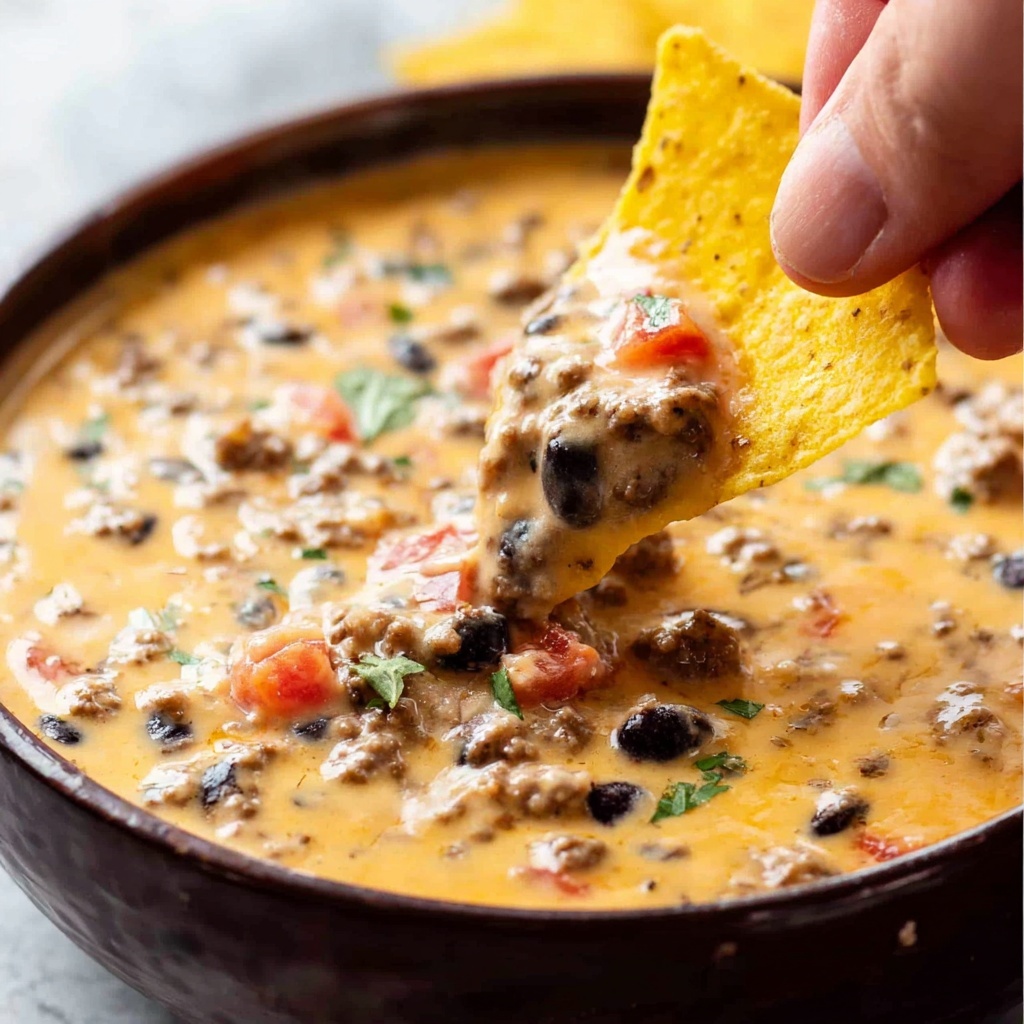 If you’re craving a warm, comforting dip that brings a party of flavors to your palate, then you absolutely have to try this Velveeta Queso with Ground Beef, Pepper Jack, and Pale Ale Recipe. It’s a savory, cheesy sensation bursting with smoky ground beef, spicy Pepper Jack cheese, and the subtle, malty richness of pale ale. Perfectly balanced with fresh cilantro, red onions, and black beans, this queso feels like a big, cozy hug that’s just waiting for tortilla chips to dive in. Whether you’re hosting game day or just want a delicious snack, this recipe elevates classic queso into a memorable crowd-pleaser.