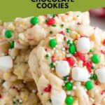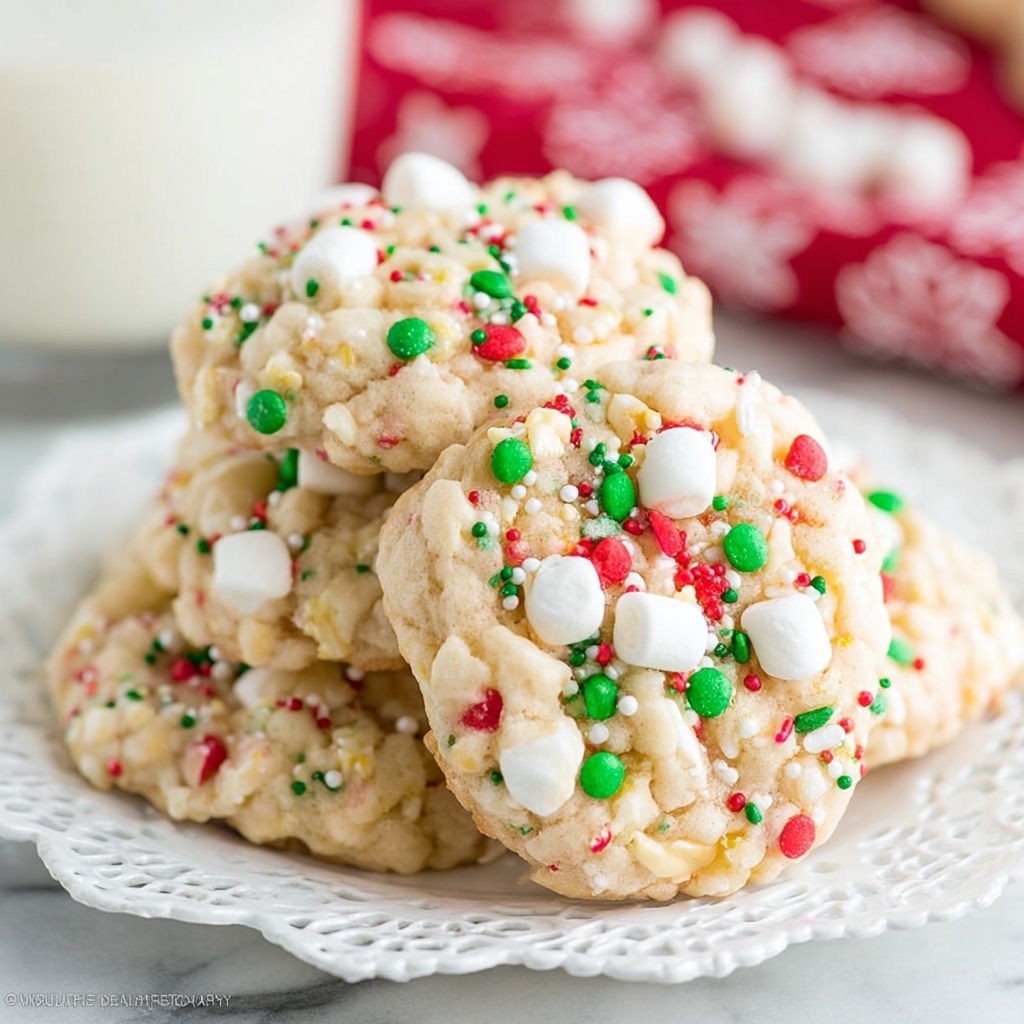 - Form Cookies and Decorate: Drop large spoonfuls of the cookie mixture onto wax paper, spacing them apart. While they are still warm and sticky, sprinkle with the remaining mini marshmallows and add sprinkles on top as desired. Allow the cookies to cool completely and harden at room temperature before serving.