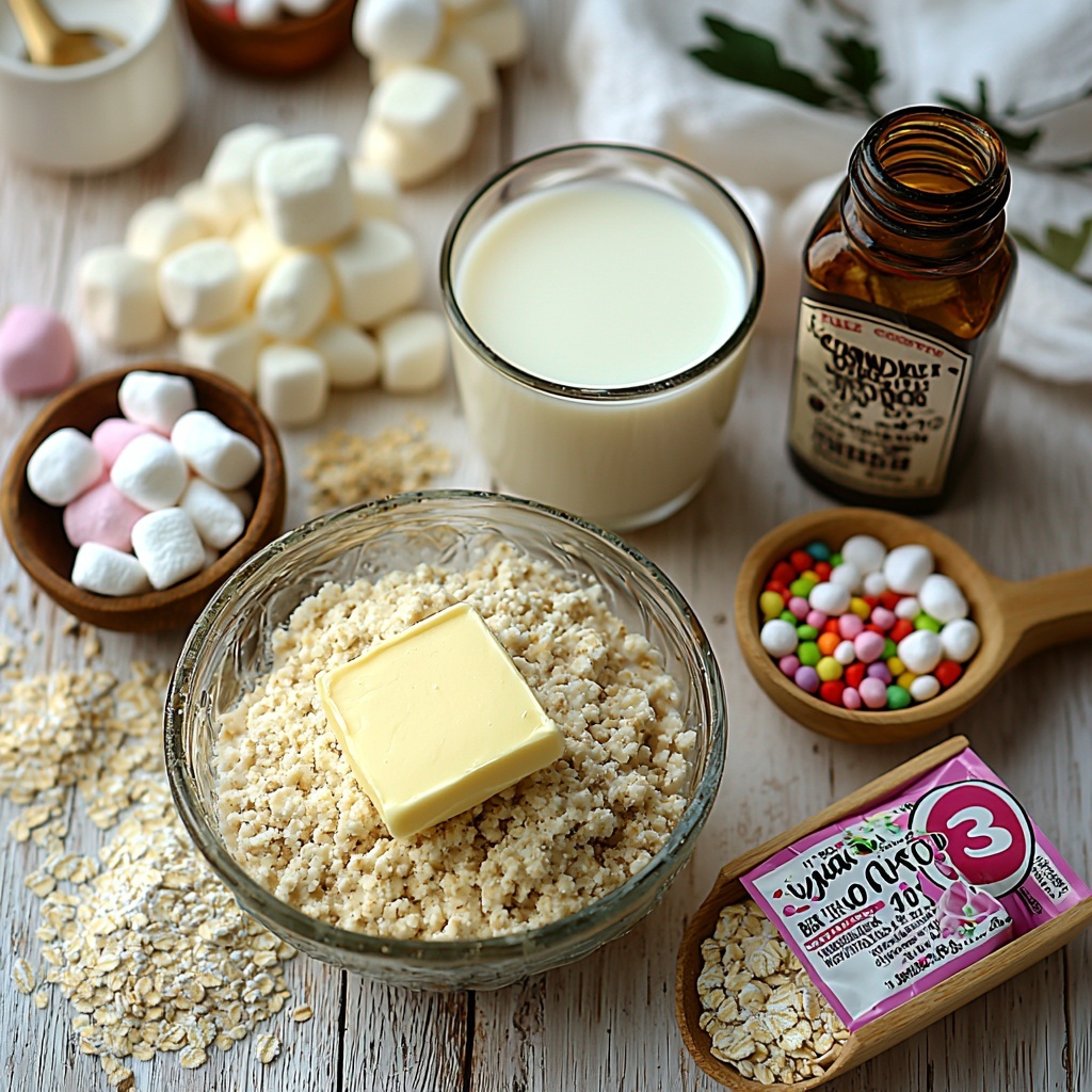 Gathering simple and thoughtfully chosen ingredients is key to achieving the perfect balance of taste and texture in this treat. Each component contributes something special — from the creamy richness to the chewy oats to the playful marshmallows that make each bite so fun and comforting.